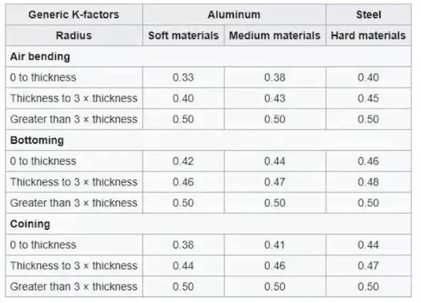 Because bending elongates the sheet, it means that the intermediate line may not be truly located in the middle of the sheet. At this point, we need to calculate the bending allowance. Firstly, we need to calculate the K-factor, which is influenced by material, thickness, bending radius, and bending method. By using the K-factor, you can obtain bending allowance.